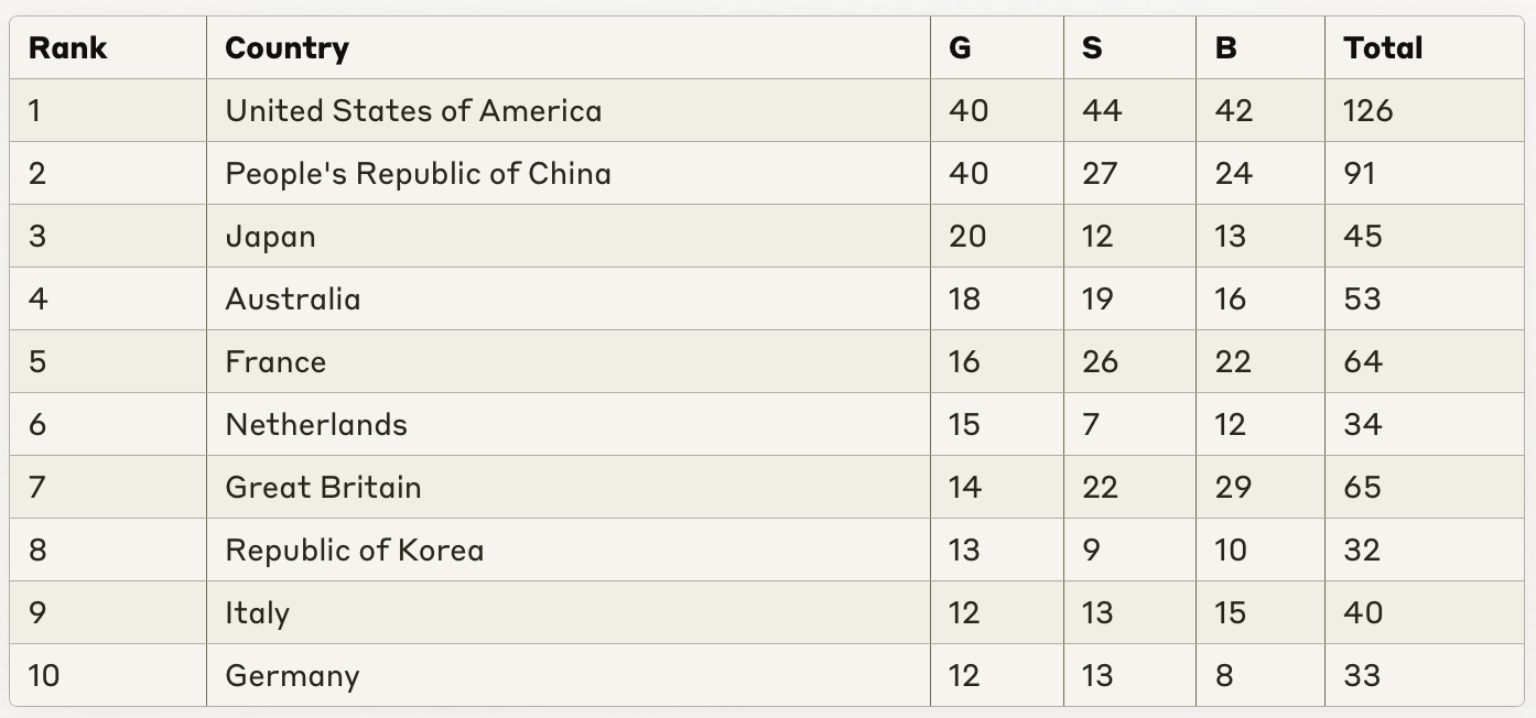 Above is a table of the total medals won by country in the 2024 Olympics. Any person could quickly see the correlation between the wealth of the nation and the amount of medals won.