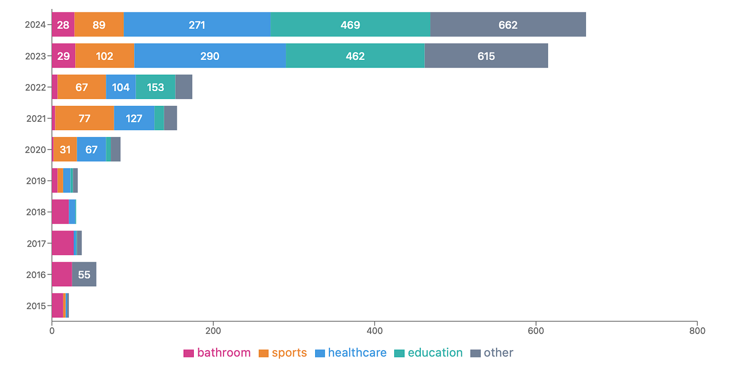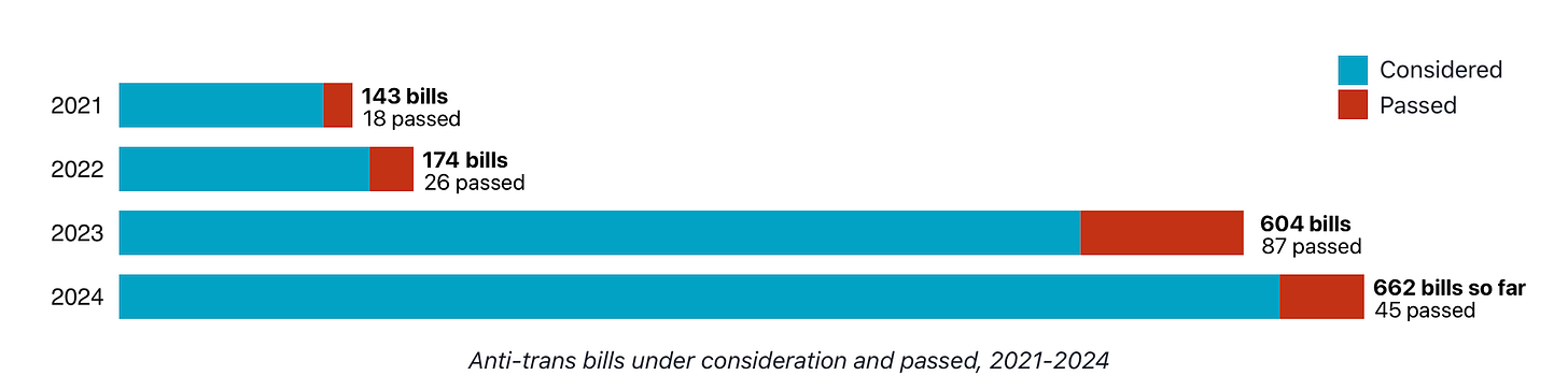 The emphasis though is on how the data is presented. And not just by sites like translegislation.com - but by all major news outlets. Because if we look deeper at the data we can see that while 143 bills were proposed in 2021, 135 failed and 18 were passed. Don’t get me wrong, 18 is a worrisome number and it’s even more worrisome that the number increased almost 10X to a total of 176 bills accepted between 2021-2024 but that’s not what the media outlets are posting. This is their narrative: