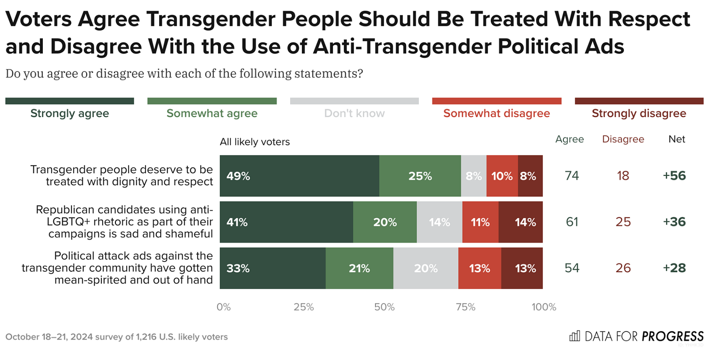 Opinions about us is also ever shifting in our favor. The progressive polling firm Data for Progress released some surprising and encouraging stats on American’s opinions about us. Well, I would say surprising to some, but I have several Trump supporters in my orbit that also support me - yes we have quite the disagreements but they don’t want me dead nor do they want me to detransition. Just look at this data for example: